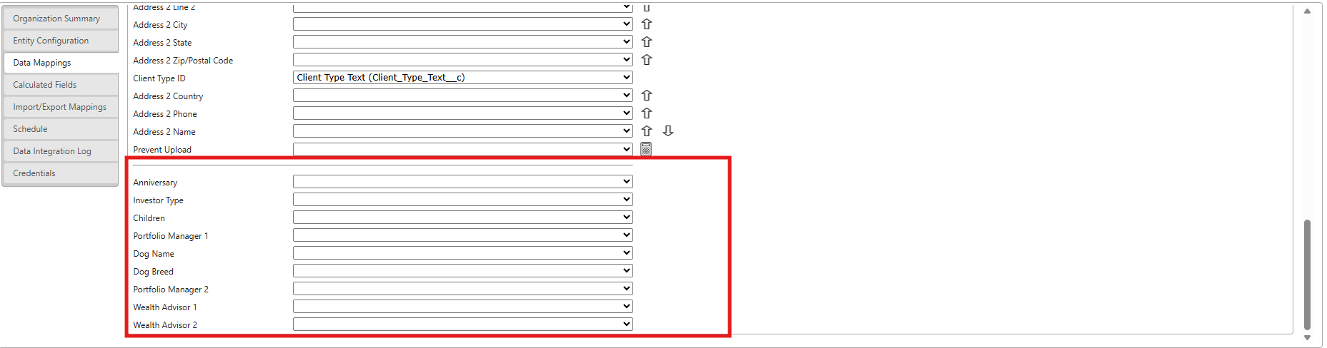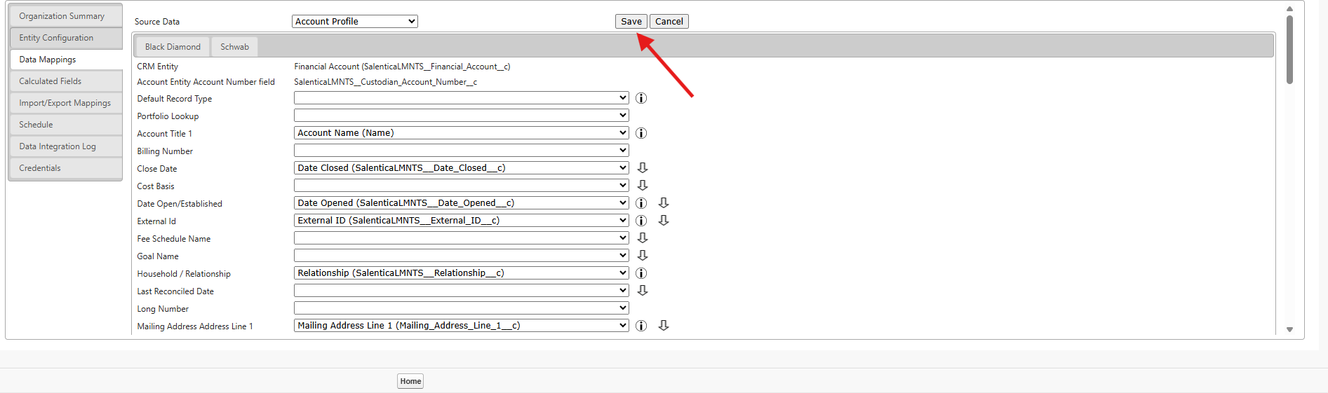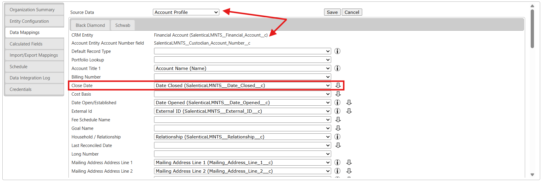 - Below that, when viewing the Data Mappings themselves, you'll see a static value on the left-hand side and a dropdown on the right-hand side. The value on the left-hand side is the data source and the dropdown on the right-hand side is the field that data will be mapped to. For example, when Date Open/Established is mapped to Date Opened then the Open Date of a Financial Account from the Source System would feed into the Date Opened field in Salesforce.