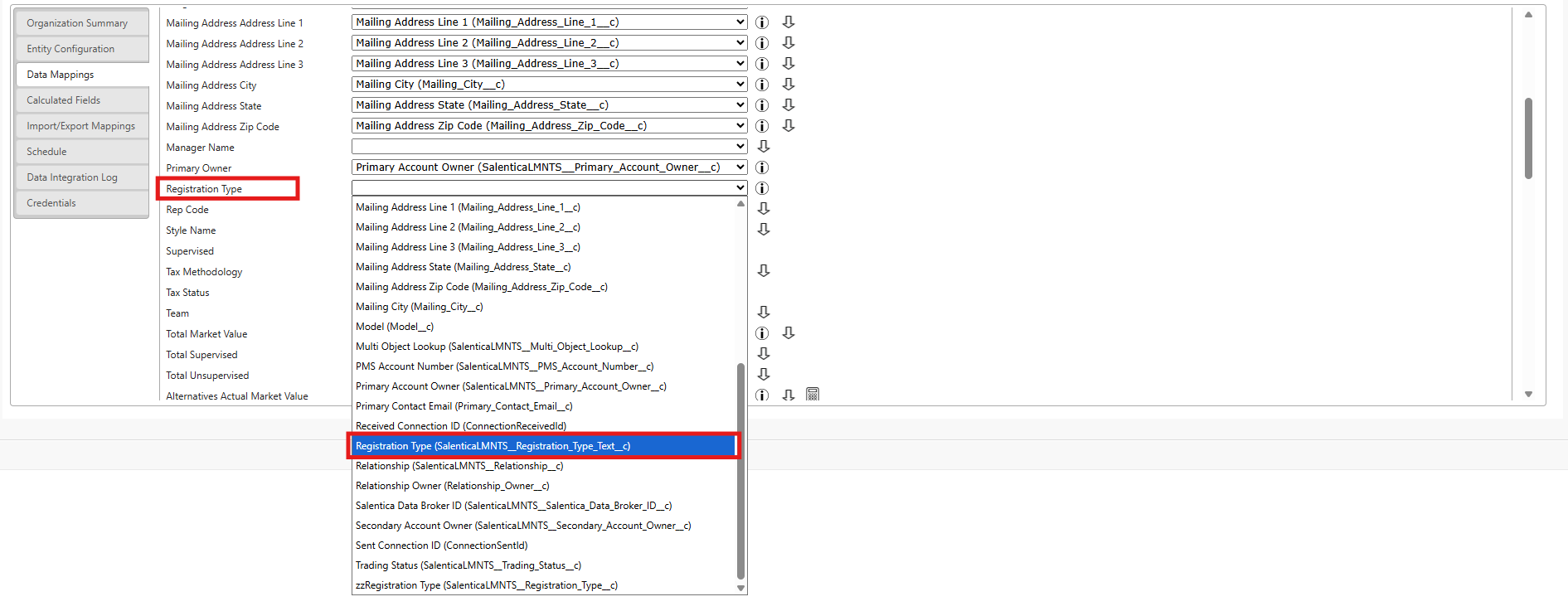 - Depending on what field that you're looking to map and to what object, you'll click the dropdown at the top to choose the Source Entity, find the datapoint that you're looking to map, and then click the dropdown next to it to choose to corresponding Salesforce field that you would like to map it to. In this example, we'll be mapping the Registration Type of the Account Profile to the Registration Type field on the Financial Account object.