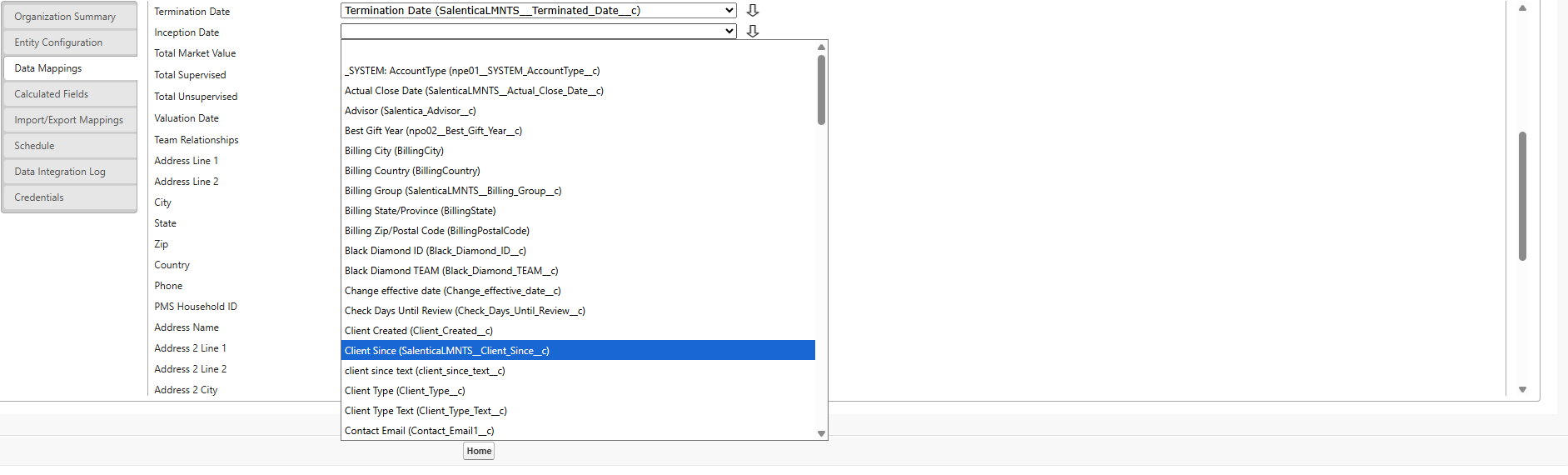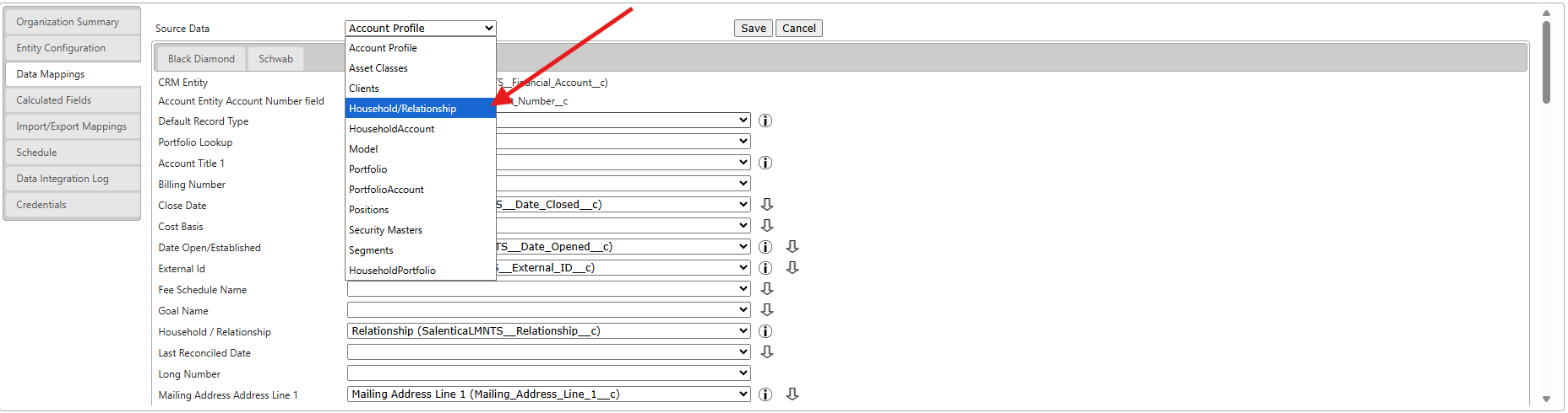 - After going back to the Data Mappings page, we're going to click Household/Relationship in the Entity dropdown at the top and then map the now available Client Since field to the Inception Date coming from the source system (in this case Black Diamond).
