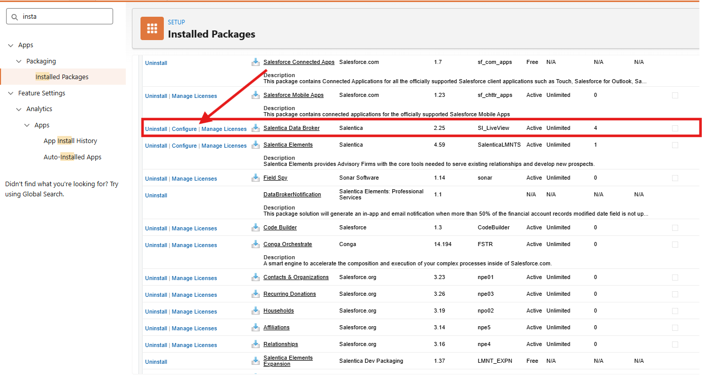 - After clicking Installed Packages, you will be taken to the page where all of the packages that your firm Users in Salesforce are listed. You'll look for the package labeled as "Salentica Data Broker" and click the Configure link next to it